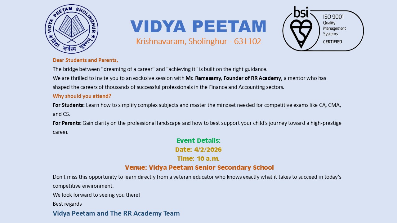 WE AT, VIDYA PEETAM SENIOR SECONDARY SCHOOL, ARE COMMITTED TO PROVIDE QUALITY EDUCATION BY